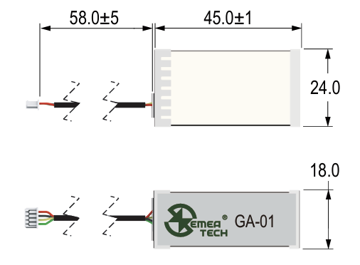 传感器封装在45x24x18±0.5mm的金属外壳中,带有约55mm的电缆作为连接接口,连接头为4针MOLEX PicoBlade™ 1.25mm(.049")连接器(参考Molex连接器,料号51021-0400) ,管脚安排为: