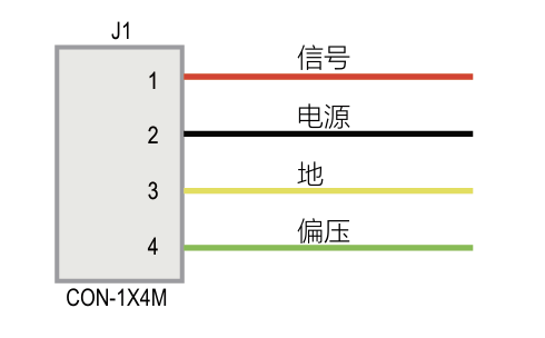 传感器封装在45x24x18±0.5mm的金属外壳中,带有约55mm的电缆作为连接接口,连接头为4针MOLEX PicoBlade™ 1.25mm(.049")连接器(参考Molex连接器,料号51021-0400) ,管脚安排为:
